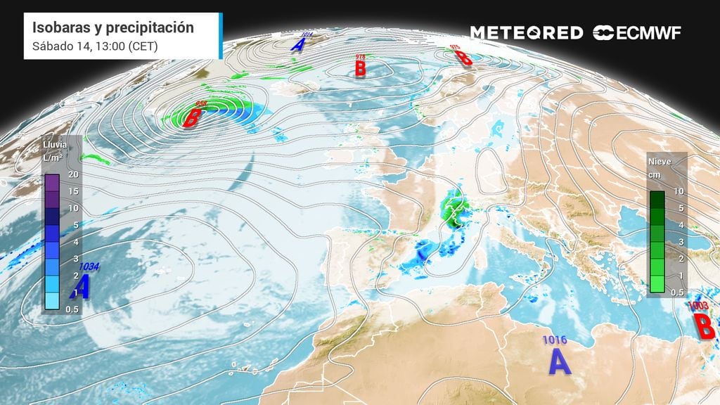 Tras una mejoría transitoria, mañana un extenso frente que cruzará el oeste de Europa irrumpirá en la España peninsular, dejando a su paso lluvias, nieve y un importante y generalizado descenso de las temperaturas.