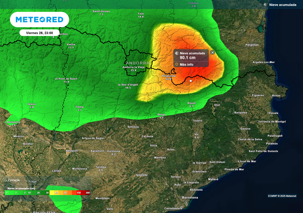 En el resto del Pirineo catalán, incluyendo áreas del Alt Urgell y el Pallars, los espesores serán más moderados pero igualmente significativos, con valores generalizados entre 15 y 30 cm, puntualmente superiores en cotas altas.