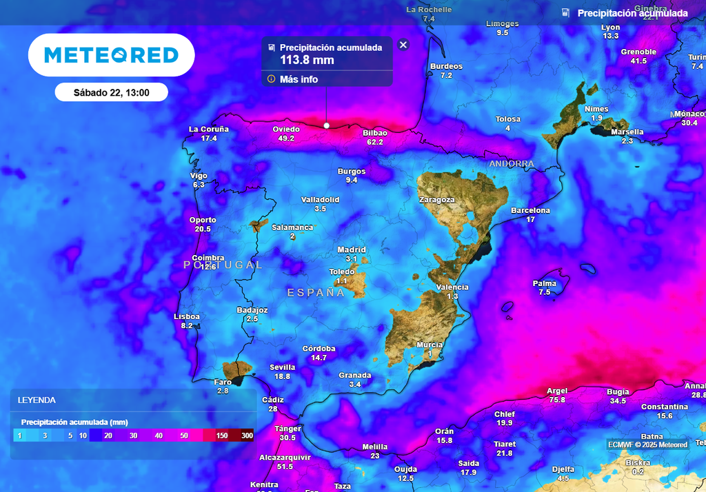 Al tener esta componente de norte tan marcada, las precipitaciones más abundantes se esperan en el extremo septentrional peninsular. El modelo europeo muestra que entre el jueves y el viernes la cota de nieve podría desplomarse localmente por debajo de los 500 metros por allí, bastante baja para las fechas, lo que da una idea de la potencia de la irrupción ártica.