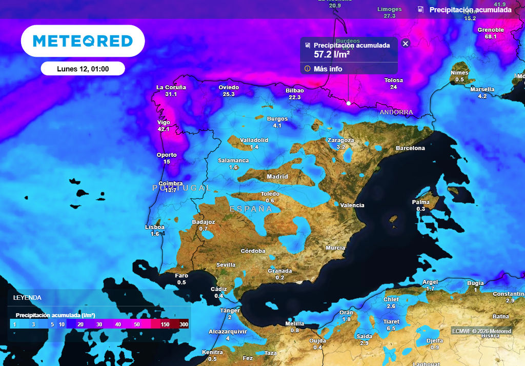 Un primer frente comenzará a dejar lluvias en el noroeste peninsular, afectando primero a Galicia, para posteriormente extenderse de forma progresiva hacia otras comunidades del norte y del nordeste. Los mapas de acumulación ya advierten de registros destacados, con especial incidencia en Galicia, donde los acumulados podrían superar los 50 l/m², y lluvias persistentes también en zonas de la cornisa cantábrica, Aragón y Cataluña.