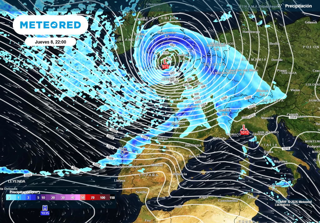 Esta rápida profundización dará lugar a un importante cambio de tiempo, favoreciendo un episodio de lluvias abundantes en varias zonas del país, especialmente en el noroeste peninsular. En lo que queda de jueves, las precipitaciones se intensificarán de forma notable en Galicia, donde podrán dejar acumulados superiores a los 40 l/m² en 12 horas en el interior de la provincia de Pontevedra y en áreas colindantes.
