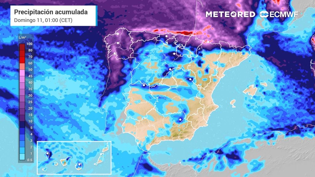 Los mapas advierten: más de 50 l/m2 en estas 8 comunidades hasta el domingo, 11 de enero