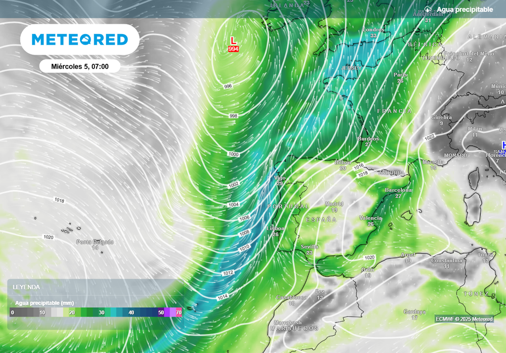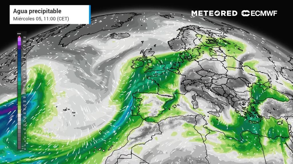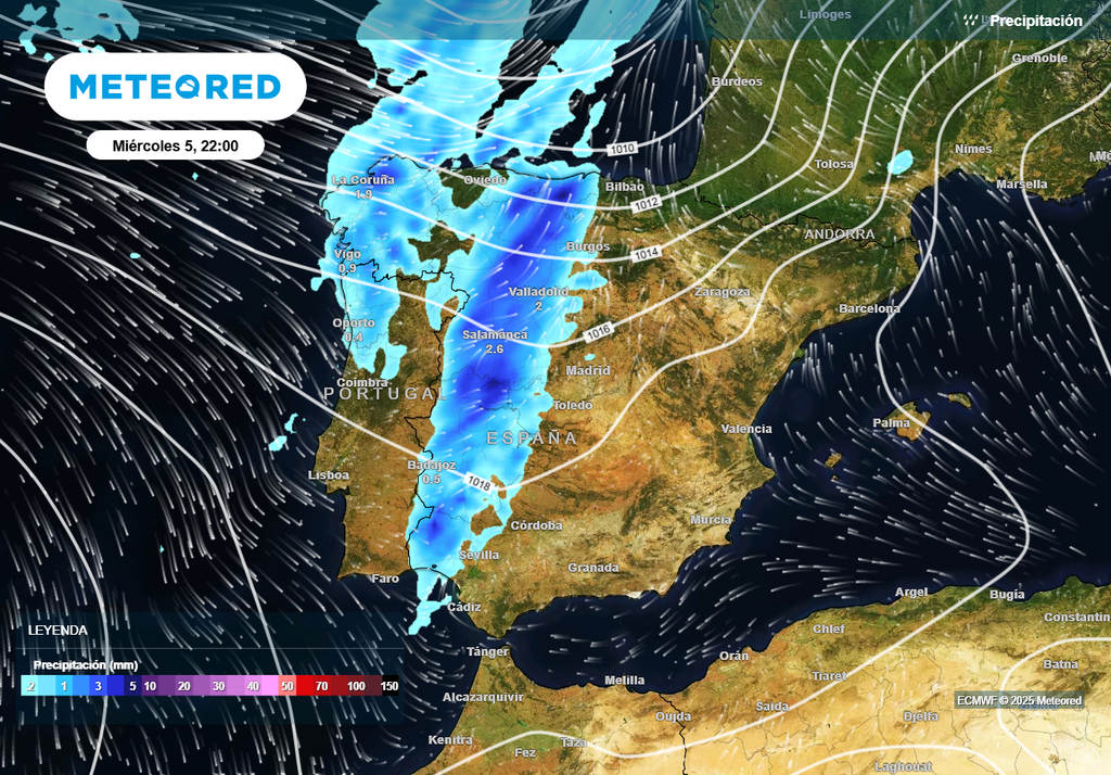 Entre el miércoles y el jueves tanto el modelo europeo como el americano prevén que el frente barra la Península. Además, se verá reforzado por una vaguada en altura y por un río de humedad que llegará desde el Atlántico. Los mapas muestran lluvias moderadas, puntualmente algo intensas, en Galicia, Castilla y León, Extremadura, comunidades cantábricas, extremo occidental de Castilla-La Mancha y oeste de Andalucía en la jornada del miércoles.