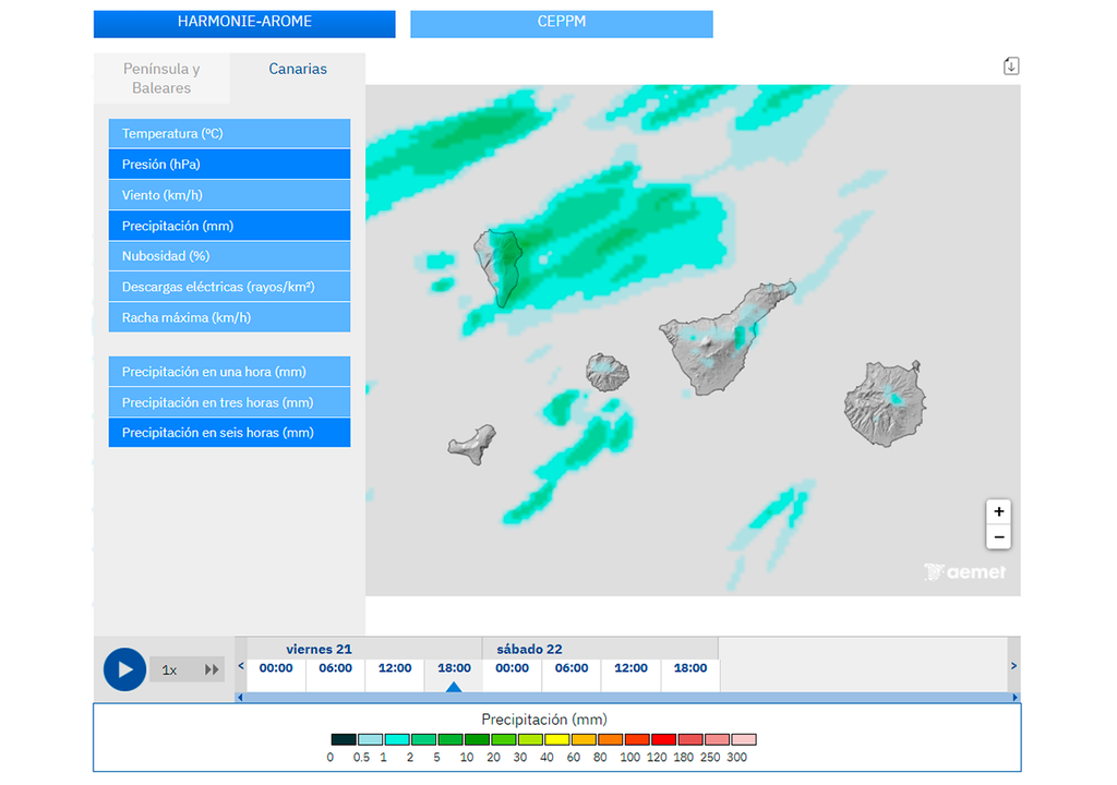 En cambio, en la vertiente occidental de La Palma no lloverá debido al efecto foehn. Estas precipitaciones en la cara este, que no descartamos que muy puntualmente pueden pasar de los 80-100 l/m² en el episodio, provocarán algunas pequeñas crecidas de barrancos y desprendimientos, por lo que pedimos tanto a la población como a los turistas que sigan las recomendaciones pertinentes de los organismos oficiales.