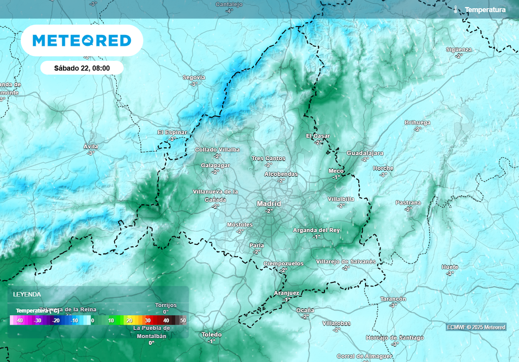 Desde la medianoche del sábado, las temperaturas se desplomarán en la Comunidad de Madrid, con heladas que se irán extendiendo de norte a sur. Las temperaturas más bajas se prevén a primera hora de la mañana, justo al amanecer o un poco antes. El mercurio bajará hasta los -2 ºC en Madrid, Tres Cantos, Alcobendas, Villalbilla, Galapagar, Collado Villalba, Villanueva de la Cañada, Móstoles, Parla y Ciempozuelos.