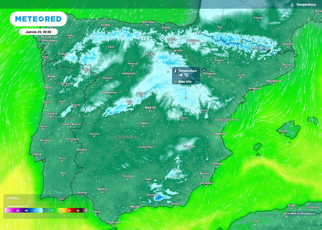 Se han llegado a registrar mínimas de -17 ºC en Sierra Nevada y -12 ºC en la Cordillera Cantábrica y en los Pirineos. Próximamente, en días tan señalados como la Nochebuena y la Navidad, los valores termométricos serán aún más bajos. Además de mínimas por debajo de los 0 ºC, las máximas solo superarán ligeramente los 15 ºC en Alicante, Almería, Málaga, Tarragona y Melilla.