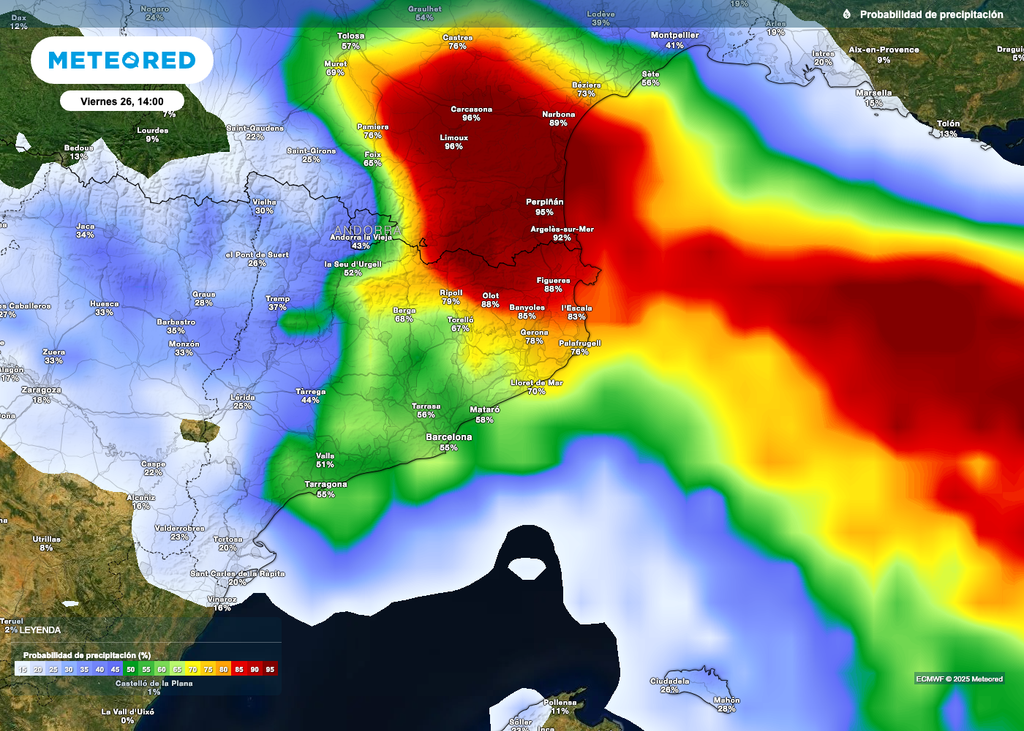 Mañana entrará una masa de aire frío del norte y la atmósfera seguirá inestable en el este peninsular, lo que dará origen a chubascos en algunas comarcas del litoral valenciano, Cataluña, donde pueden ser localmente fuertes y tormentosos, y Baleares.