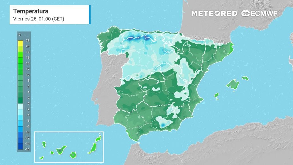 Las temperaturas mínimas descenderán de forma generalizada, con numerosas y fuertes heladas. Soplarán vientos de componente norte, con intervalos fuertes en la vertiente cantábrica y moderados en el Estrecho así como en zonas próximas.