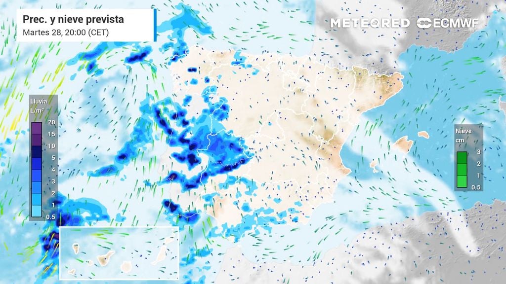 A esta configuración, se sumará que dominará el flujo de vientos del oeste y suroeste, los ábregos, conocidos también con los vientos llovedores en buena parte del país, que transportarán abundante humedad desde el Atlántico, intensificando las precipitaciones más expuestas a esta circulación.