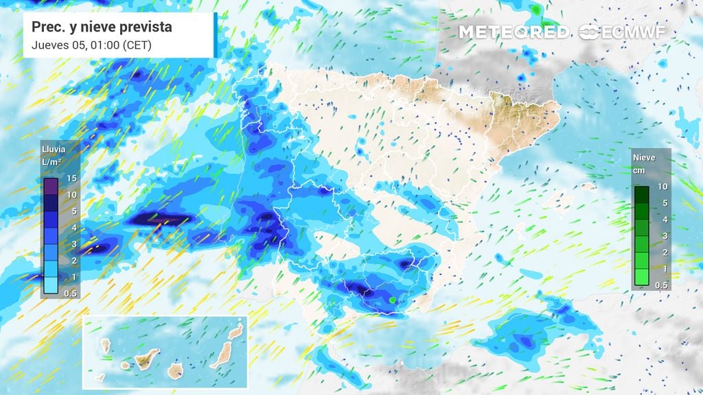 Según el modelo europeo, las precipitaciones irán a más en el oeste peninsular. Las lluvias ganarán extensión e intensidad en Galicia, Extremadura, oeste de Castilla y León y Andalucía occidental, donde los acumulados comenzarán a ser ya significativos antes de finalizar el día.