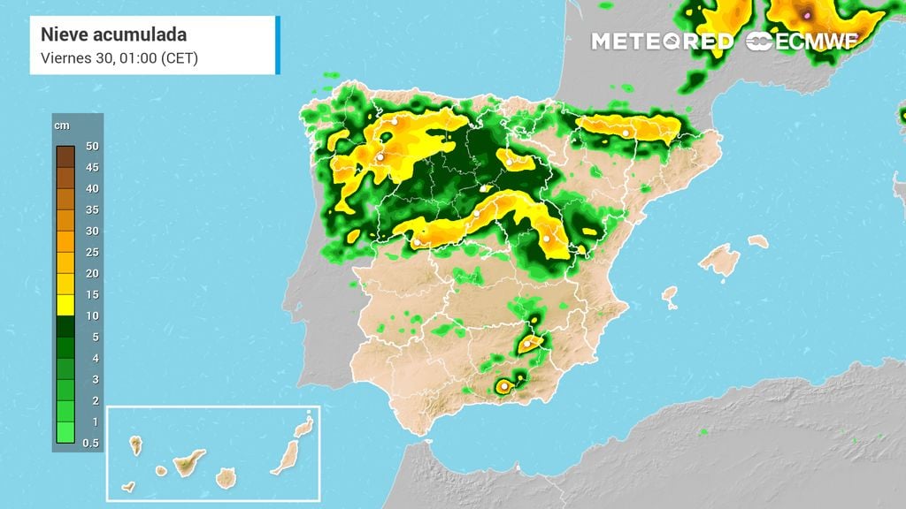 Se esperan importantes acumulaciones en todos los sistemas montañosos de la mitad norte peninsular, especialmente en la Cordillera Cantábrica, el Sistema Central y el Ibérico, pudiendo nevar en ciudades como Cuenca. Habrá nevadas también en los Pirineos, aunque en menor cuantía. Atención a las carreteras, ya que se espera una situación complicada, sobre todo en la primera parte de mañana.