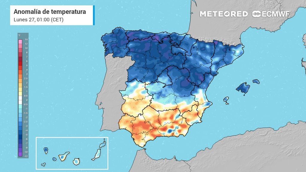 Este domingo la masa de aire polar se extenderá por España tras el paso del frente y dejará a su paso un descenso térmico notable: en algunas zonas las máximas se desplomarán hasta 10 ºC.