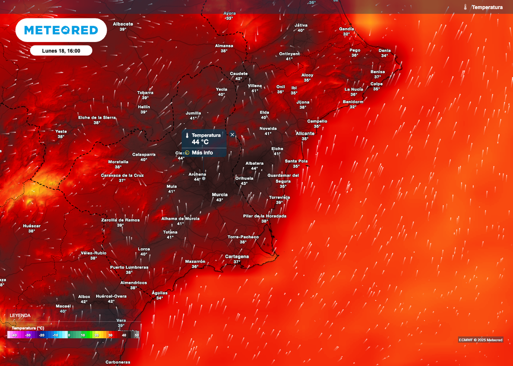 Estas condiciones van a permitir que Murcia supere ampliamente los 40 °C en prácticamente todo su territorio, con valores extremos que podrían alcanzar los 45 °C en algunas zonas.