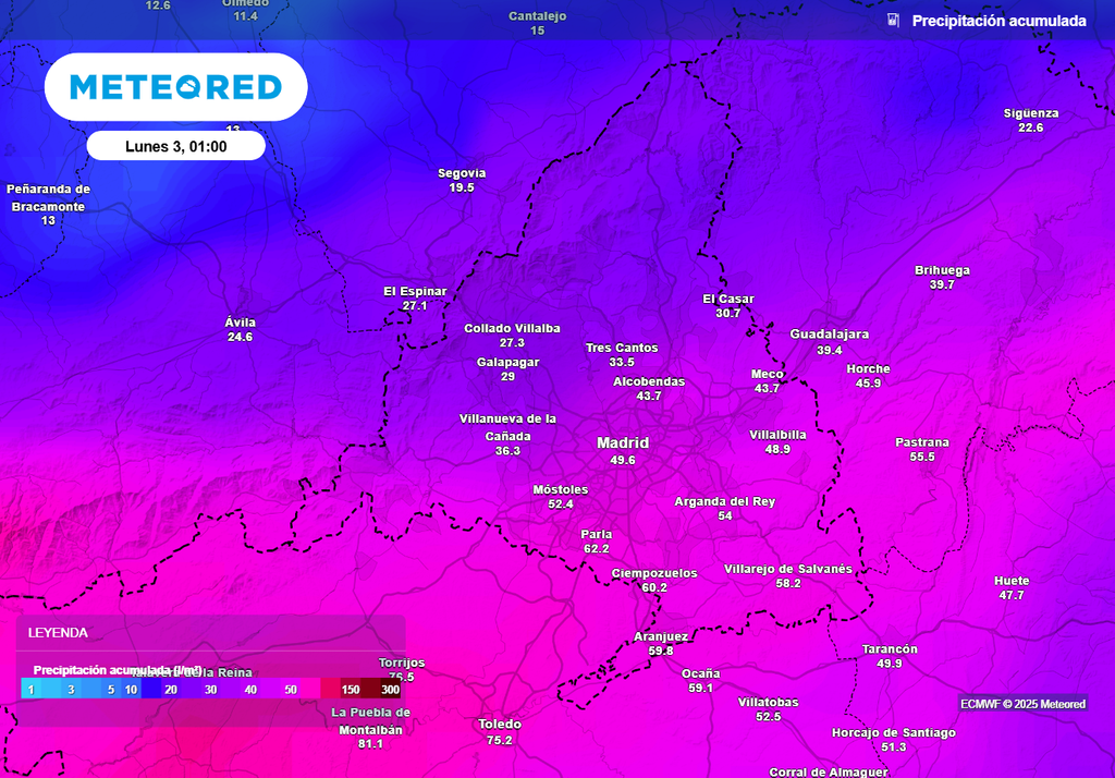 En la ciudad de Madrid se irán acumulando litros por metro cuadrado desde el inicio hasta el fin del día, pudiendo llegar a sumar cantidades entre los 25 y los 30 l/m2. Esta última cantidad se podrá llegar a superar en algún enclave madrileño. Durante la tarde y al caer la noche es cuando lloverá con mayor persistencia e intensidad en la ciudad. El día será más fresco, con temperaturas máximas previstas de 16-18 ºC en el centro de la ciudad y área metropolitana.