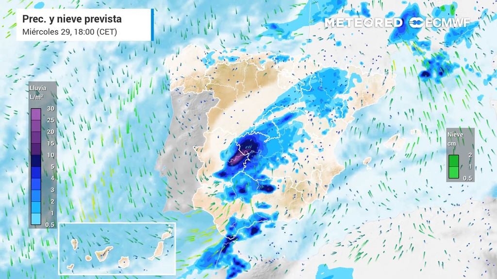 Este primer episodio de lluvias está asociado a una borrasca que está situada al oeste de la Península y que a lo largo del día de hoy se irá acercando. Mañana la borrasca irá cruzando el sur. Hoy martes comenzará a llover por el extremo occidental peninsular. Las lluvias más intensas las esperamos en Galicia, Extremadura y el oeste de Andalucía, ya a últimas horas. En Madrid comenzará a llover de noche, al final de la jornada y lo hará con intensidad.