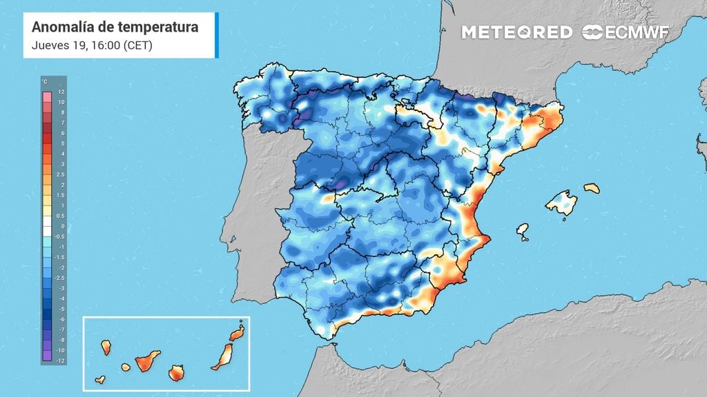 Si comparamos cómo serán las temperaturas máximas mañana jueves, respecto a las de hoy miércoles, comprobaremos como el descenso será notable en todo el interior y este peninsular. La temperatura bajará entre 6 y 10 ºC en Andalucía oriental, interior de la Región de Murcia, Comunidad Valenciana, Aragón, Sistema Central, norte de Navarra y zonas costeras del este del País Vasco. Para aquellos detractores del frío, el descenso térmico apenas durará un día: el viernes subirán de nuevo las temperaturas en toda la Península, más de 5 ºC en muchas zonas.