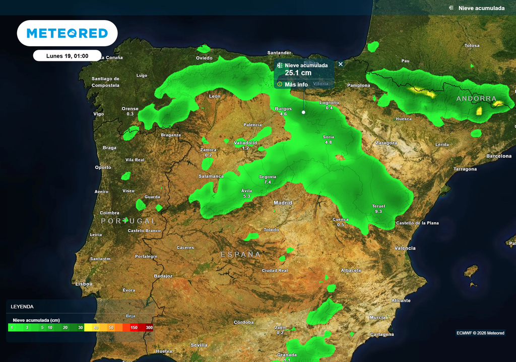 También se esperan nevadas destacables en el Sistema Central, con espesores que podrían situarse en torno a los 5–10 cm, localmente superiores en las zonas más elevadas. En el Sistema Ibérico, las nevadas serán más irregulares, pero podrían dejar espesores de 10–15 cm en áreas favorables.