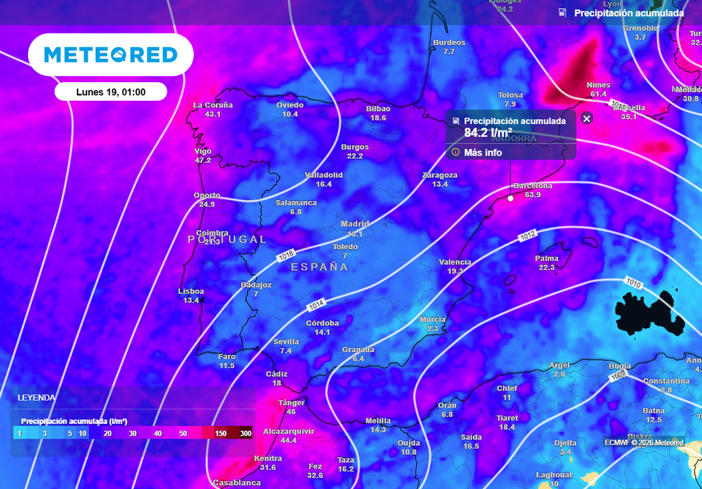 De forma paralela, en el noroeste peninsular se mantendrán las precipitaciones a lo largo del domingo, aunque más intermitentes, sumando acumulados importantes tras varios días de lluvias. En el conjunto del fin de semana, Galicia y áreas próximas podrían alcanzar o superar los 40–50 l/m2 , especialmente en zonas del oeste y del litoral.