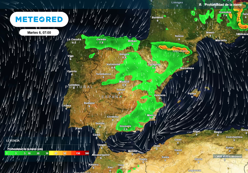 Este aire frío parece que puede ser relevado por una masa de aire algo más húmeda y templada, de origen marítimo polar a partir del día 7, con la llegada de nuevos frentes desde el Atlántico. No obstante, será imprescindible hacer un seguimiento de la situación, porque este cambio podría venir acompañado de nuevas nevadas en cotas medias o bajas con el consecuente impacto que esto supondría en las zonas pobladas que se vean afectadas.