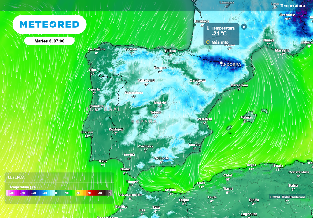 Sin embargo, las temperaturas descenderán, con heladas generalizadas en casi todo el interior durante los días 5 y 6 de enero, salvándose únicamente las zonas de costa y el extremo suroeste peninsular. Además, se registrarán máximas negativas en el entorno de los principales macizos montañosos.