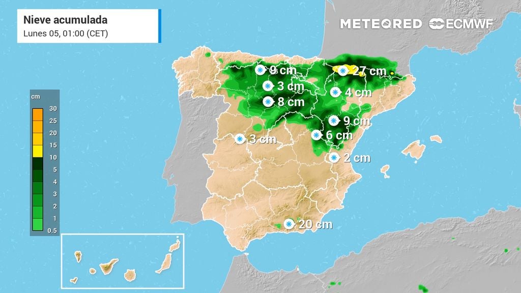 Estas nevadas comenzarán a producirse desde primeras horas del domingo 4 de enero en zonas de montaña del noreste de Castilla y León, siendo las precipitaciones en forma de lluvia más al sur. Sin embargo, según la masa de aire frío avance hacia el sur, la cota de nieve se desplomará en en la vertiente mediterránea y, ya a últimas horas de ese día, permitirá que las nevadas se extiendan al resto de zonas mencionadas, pudiendo persistir durante el día 5.