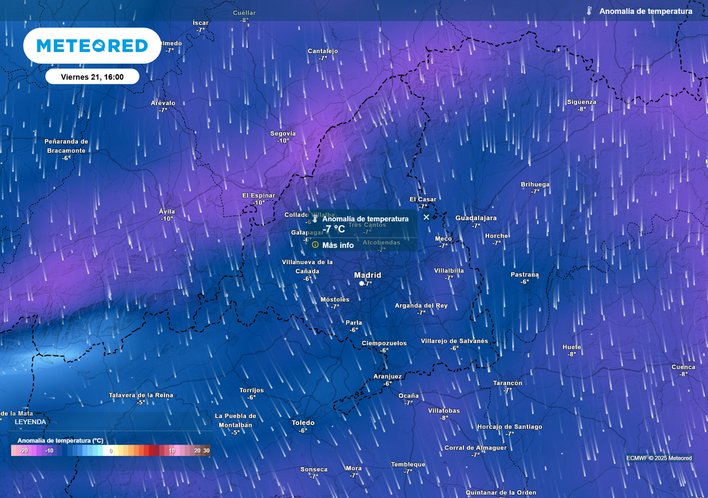 En la jornada del jueves habrá un envite de aire aún más frío, que se asentará durante el final de la semana dejando mínimas de 2 ºC el jueves, 1 ºC el viernes y valores negativos el sábado. Madrid despertará con -2 ºC.