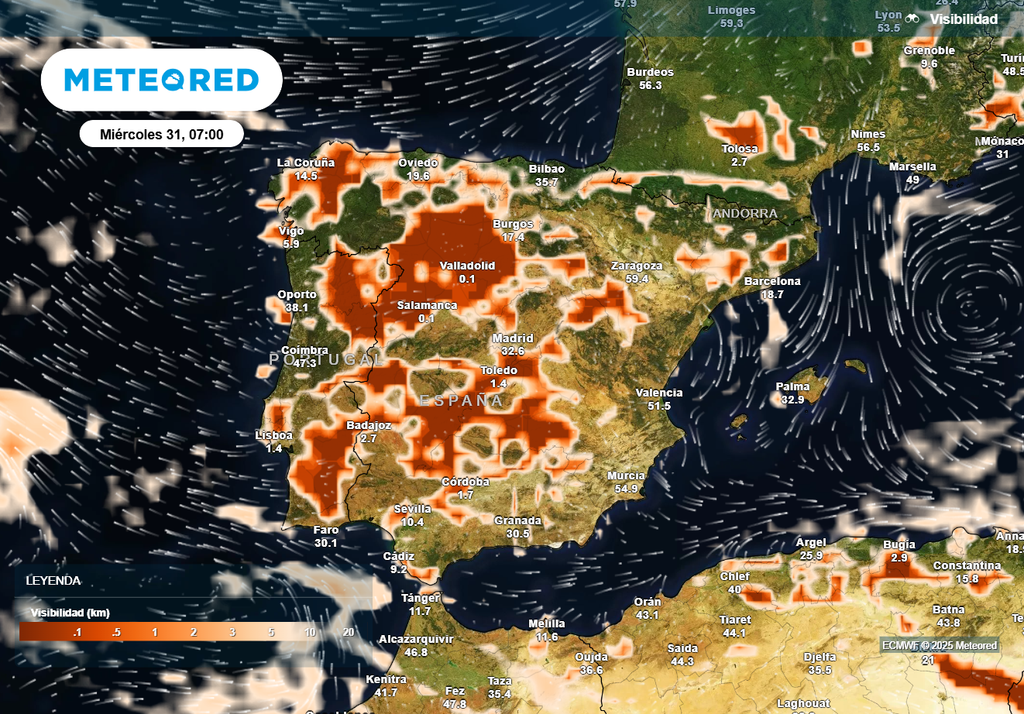 Hoy martes se han formado nieblas por distintas zonas del interior peninsular. Las más densas y persistentes las tenemos en el interior de Galicia, la meseta Norte, el nordeste peninsular y algunas zonas bajas de la mitad sur. Desde la pasada madrugada hay activados avisos amarillos de AEMET por una reducción de la visibilidad de hasta 100 y 200 m tanto en la provincia de Lugo, como en Valladolid, Zamora, Salamanca, la meseta de Ávila y gran parte de Extremadura.