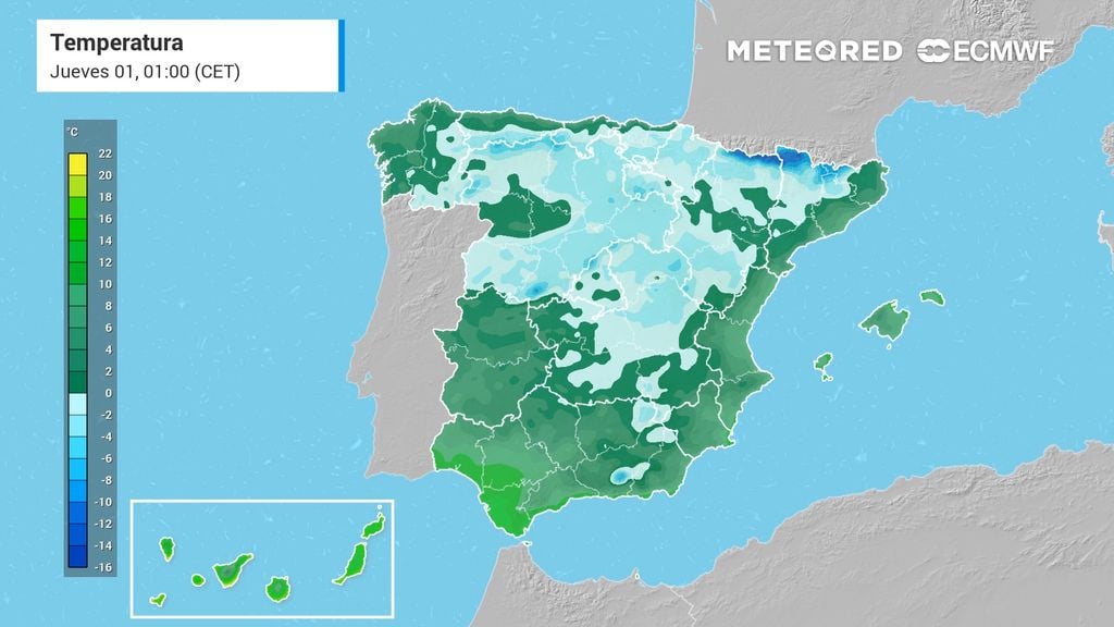 El inicio del Año Nuevo será muy frío y con presencia de nieblas por amplias zonas del interior de la Península. Las heladas serán más generalizadas. Hasta en un total de 20 capitales de provincia la temperatura caerá hasta los 0 ºC o por debajo la primera madrugada de 2026. Las mínimas serán más bajas, en general, que las que se registren el día 31. Será en el cuadrante nordeste peninsular donde se produzcan los mayores descensos de las temperaturas nocturnas.