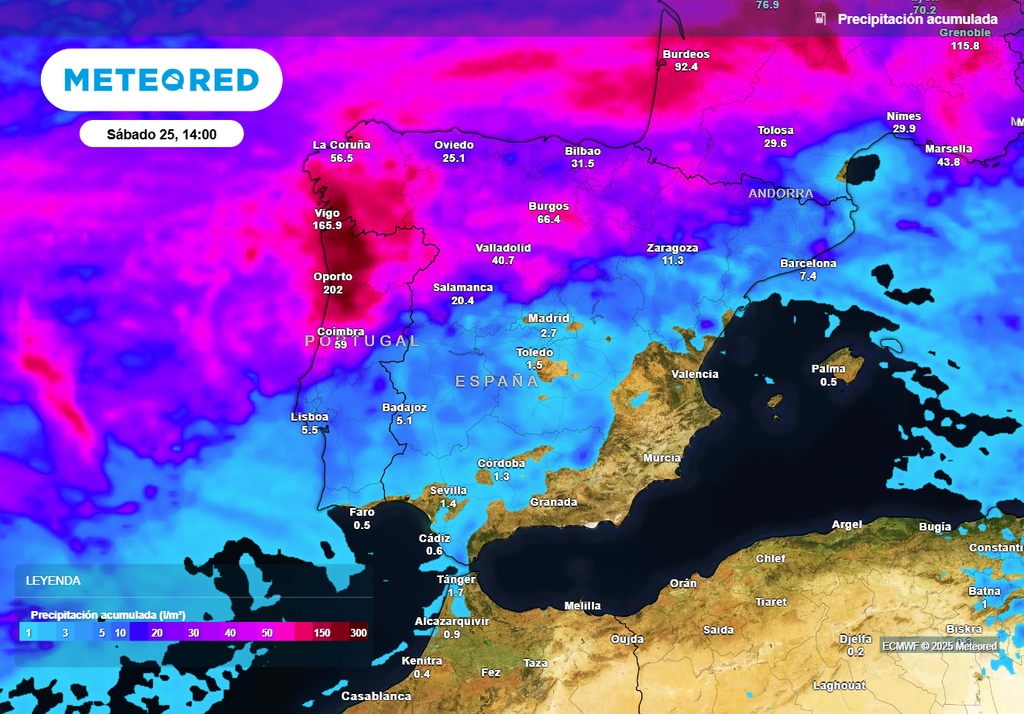 Con esta situación, los acumulados serán muy considerables en el oeste gallego, especialmente en la provincia de Pontevedra, donde superarán los 200 l/m² e incluso en sectores localizados bien expuestos a este flujo húmedo de carácter subtropical pueden irse por encima de los 300 l/m². En otros puntos de Ourense, Lugo y A Coruña sobrepasarán los 100 l/m².