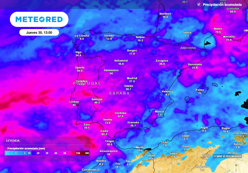 Cabe destacar que estas bajas impulsarán masas de aire subtropical muy húmedas desde el Atlántico, con algunos ríos atmosféricos. Es probable que a lo largo de la semana se acumulen más de 100 l/m² en puntos del oeste de Galicia, sector occidental del Sistema Central, Extremadura y en las sierras del oeste de Andalucía. Sin embargo, esto aún puede variar bastante.