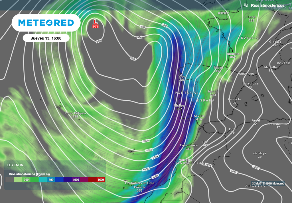 Hasta el sábado pueden acumularse más de 150-200 l/m² en el oeste de Galicia, mientras que en la vertiente oeste de La Palma se podrían ir por encima de los 120-140 l/m² de forma local. Pasarán de los 100 l/m² en otras comarcas gallegas, entorno del oeste del Sistema Central y vertientes suroestes de las islas occidentales y centrales de Canarias. Prácticamente no lloverá en amplias zonas del este y Baleares, ni tampoco en el Cantábrico oriental por el viento sur.