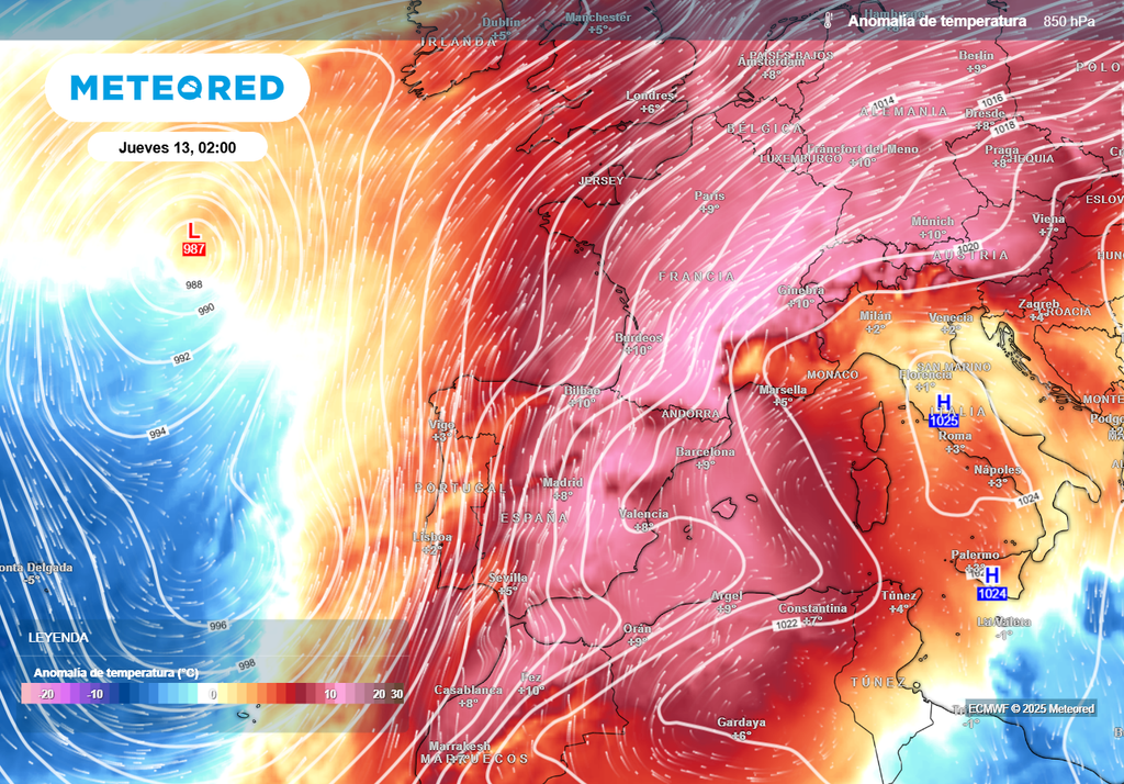 La posición de la borrasca favorecerá la entrada de vientos del sur, que canalizarán una masa de aire anormalmente cálida para la época, dando lugar a un ascenso generalizado y localmente acusado de las temperaturas. Esta advección extremadamente suave se extenderá prácticamente por todo el oeste de Europa.