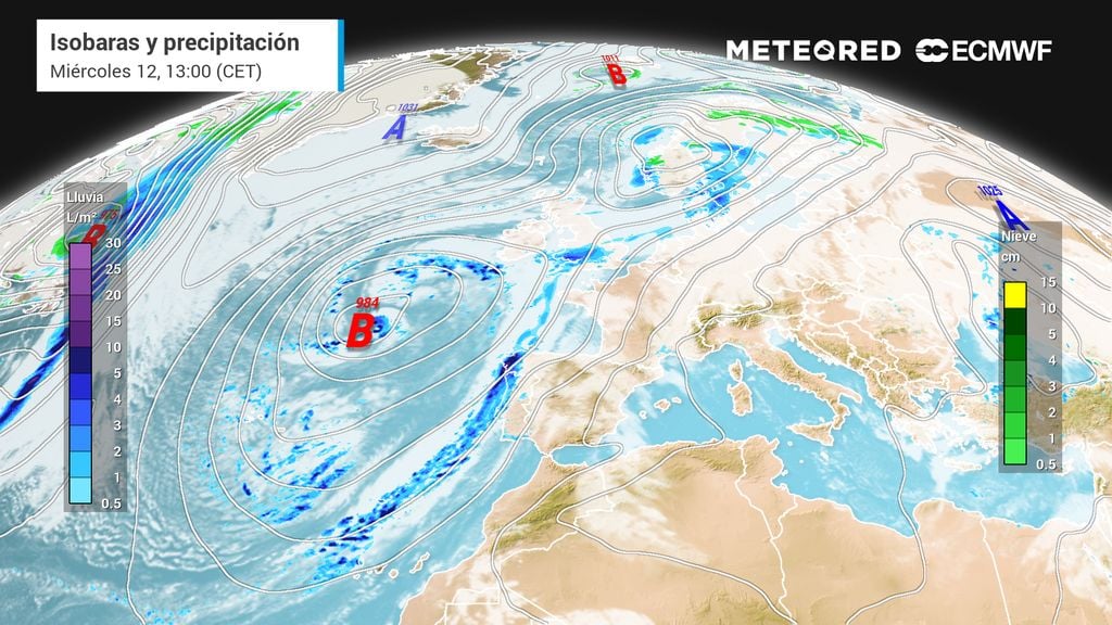 La borrasca se situará frente a las costas del oeste peninsular, manteniéndose bastante estacionaria debido al bloqueo en latitudes altas. Dejará lluvias localmente intensas e impulsará una masa de aire muy suave.