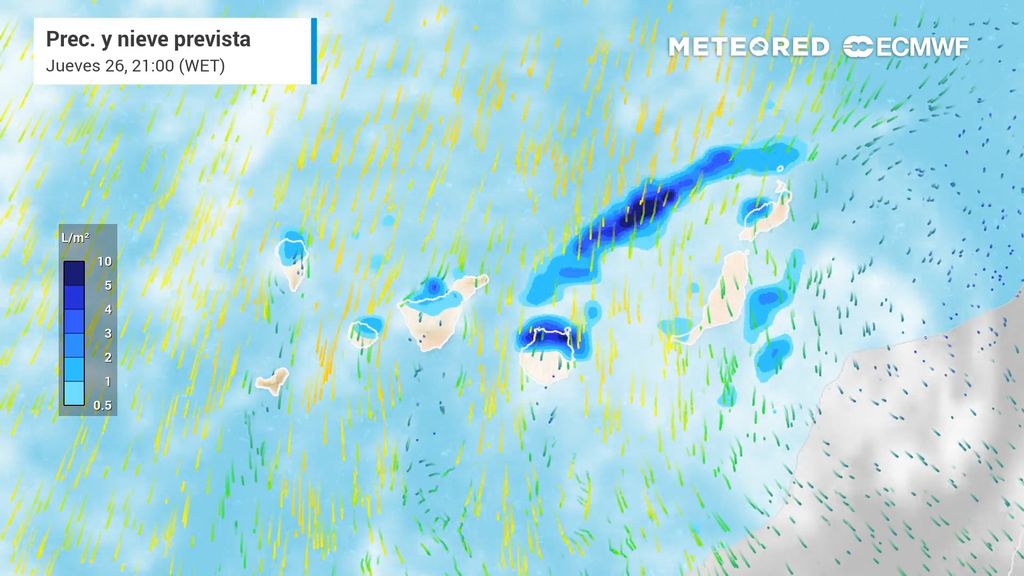 Hoy será la jornada más adversa de la semana en Canarias, con lluvias localmente intensas, con posibilidad de nieve en cumbres de La Palma y Tenerife. Se mantienen avisos por precipitaciones que pueden superar los 15 l/m² en una hora en las islas más orientales, donde además se pueden registrar algunas tormentas.