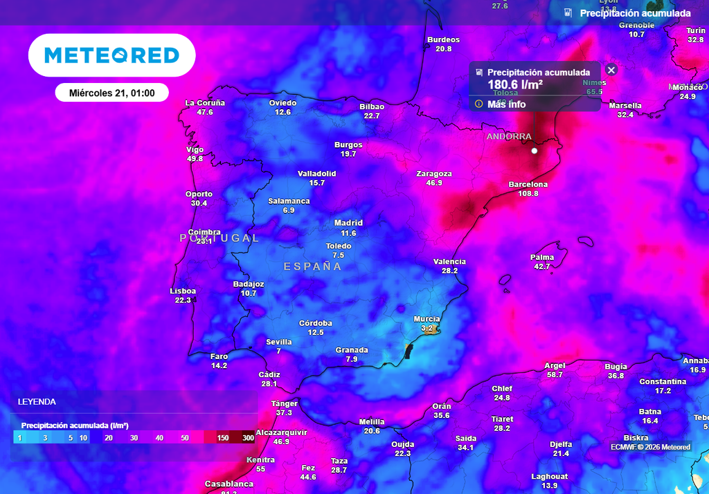 El martes serán más abundantes las precipitaciones en la vertiente mediterránea y en el suroeste de la Península. Las temperaturas seguirán bajando. Serán numerosas las heladas y nevará en todos los sistemas montañosos: atención a los espesores previstos en el Pirineo catalán y oscense, ya que podrían acumular hasta un metro de nieve nueva en el temporal.