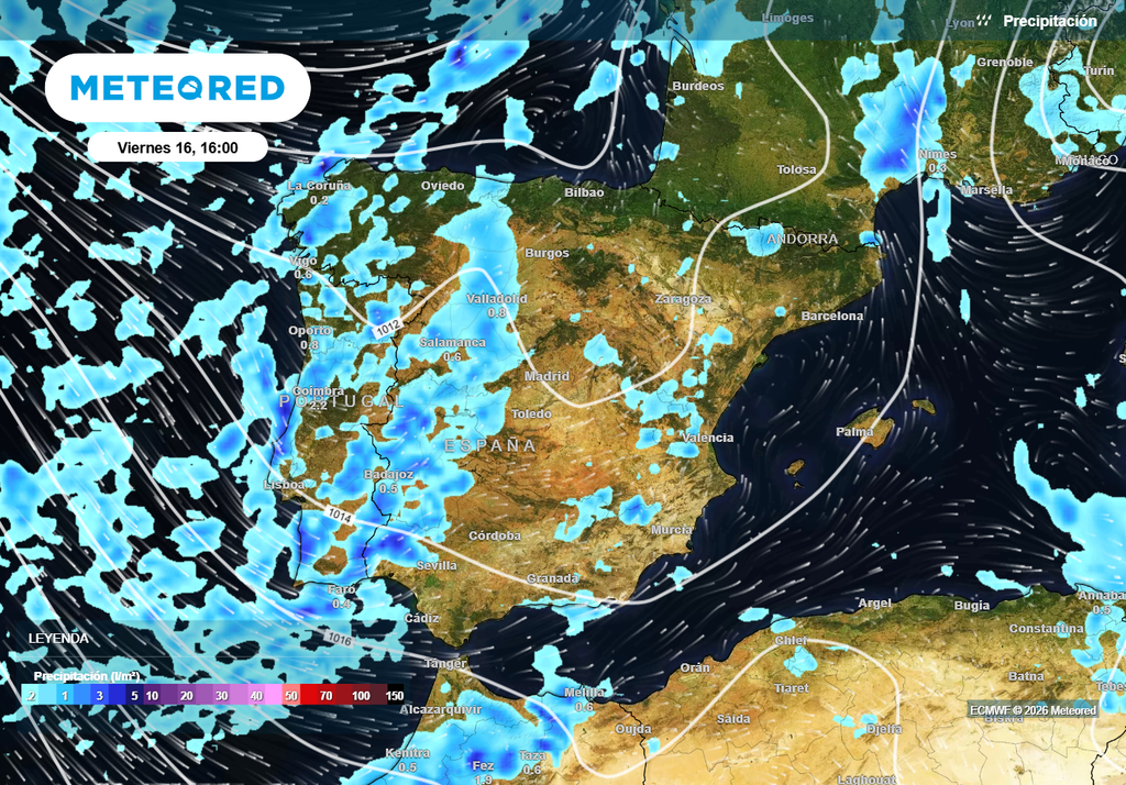 Mañana viernes se mantendrá la inestabilidad en la Península debido al paso de un nuevo frente que seguirá produciendo precipitaciones casi generalizadas, aunque serán menos probables en las regiones cantábricas y en las mediterráneas peninsulares, así como en Baleares. Serán más abundantes en Galicia y en la mitad occidental de Andalucía, donde serán localmente fuertes.