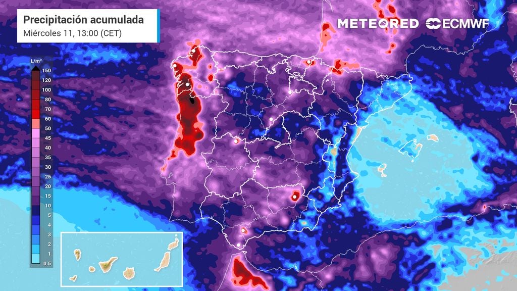 Los acumulados más cuantiosos se concentrarán en la provincia de Pontevedra, donde según el modelo europeo podrían caer unos 250 l/m² en puntos de las sierras. En otras comarcas de Galicia se esperan registros de más de 100-150 l/m², al igual que en el entorno de Sanabria, mitad septentrional del País Vasco, norte de Navarra, Pirineo oscense, entorno de la Val d'Aran (Lleida), vertiente segoviana de la sierra de Guadarrama, Ibérica burgalesa, sierras de Segura-Cazorla (Jaén), valle del Jerte (Cáceres) y en la sierra de Grazalema (Cádiz).