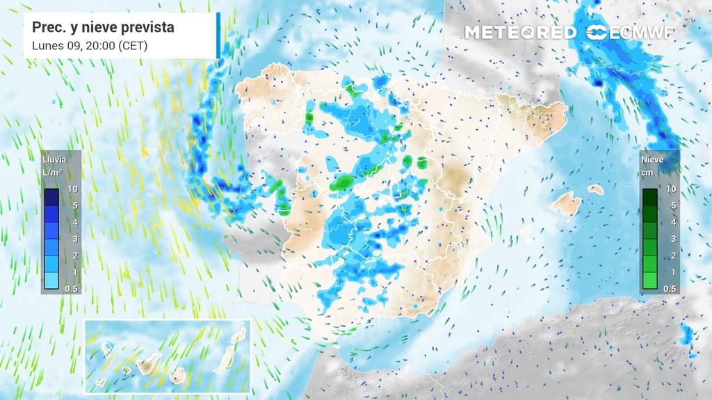 En lo que queda de lunes las precipitaciones se irán trasladando desde el noroeste hacia la vertiente cantábrica, Castilla y León, Comunidad de Madrid, Castilla-La Mancha, Extremadura, Andalucía e interior del sureste. Irán acompañadas de algunas tormentas ocasionales, sin descartar granizadas puntuales. Aún quedarán algunos chaparrones irregulares en Cataluña y Baleares debido a los restos de la dana de este fin de semana.