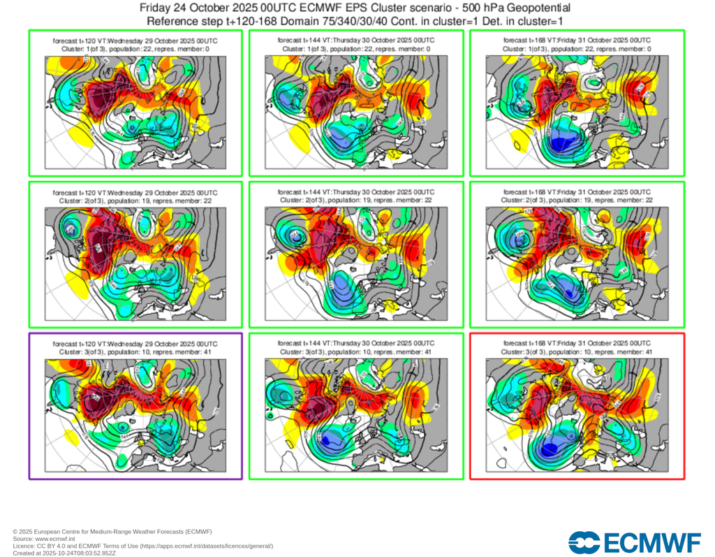 Anomalías de geopotencial a 500hPa. Cada día una columna (29, 30 y 31 de octubre) y cada fila un grupo de escenarios. El modelo europeo solo difiere en matices menores que afectarán a la distribución e intensidad de las precipitaciones y el viento.