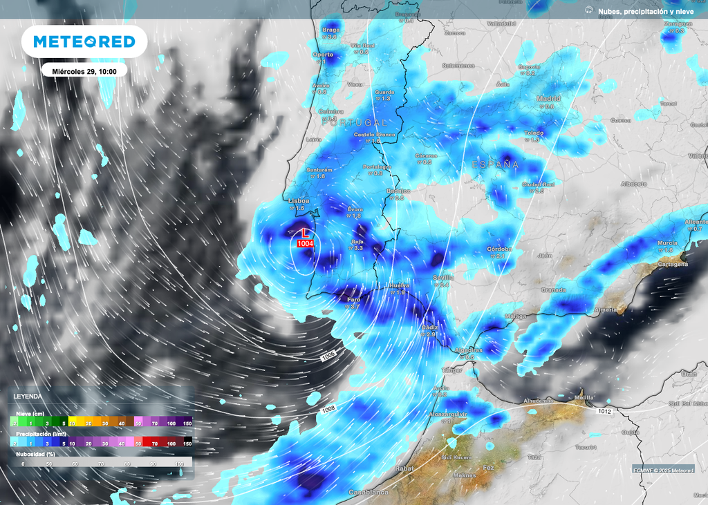 La primera de estas grandes borrascas en llegar al entorno peninsular lo hará el miércoles. Se situará frente a Portugal e inducirá una advección del sur bastante generalizada volviendo a extenderse las lluvias por casi todo el territorio.