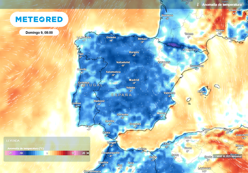 No obstante, durante unas horas habrá una breve situación de estabilidad que coincidirá con la entrada de una masa de aire fría, impulsada por los vientos del norte y noroeste que canalizarán la borrasca del Mediterráneo y las altas subtropicales. El viento calmará esta próxima madrugada en gran parte de España, lo que junto a los cielos despejados y el aire polar ayudará a que las temperaturas se desplomen al caer el sol.