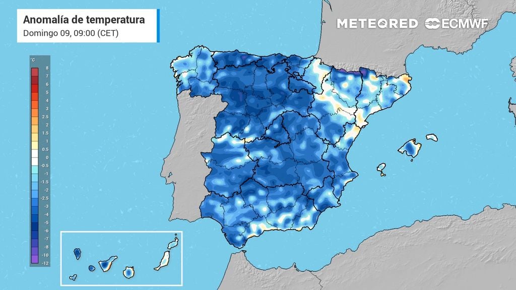 Los mapas anticipan que las temperaturas nocturnas caerán de 2 a 5 ºC en casi toda la España peninsular esta próxima madrugada, localmente más en los principales valles y otras depresiones. Como es habitual en esta época, el mercurio tocará fondo entre las 7:00 y las 8:00 h de la mañana, instantes antes del amanecer. En Baleares y Canarias no cambiarán demasiado gracias a su carácter insular: son islas rodeadas de aguas aún templadas.