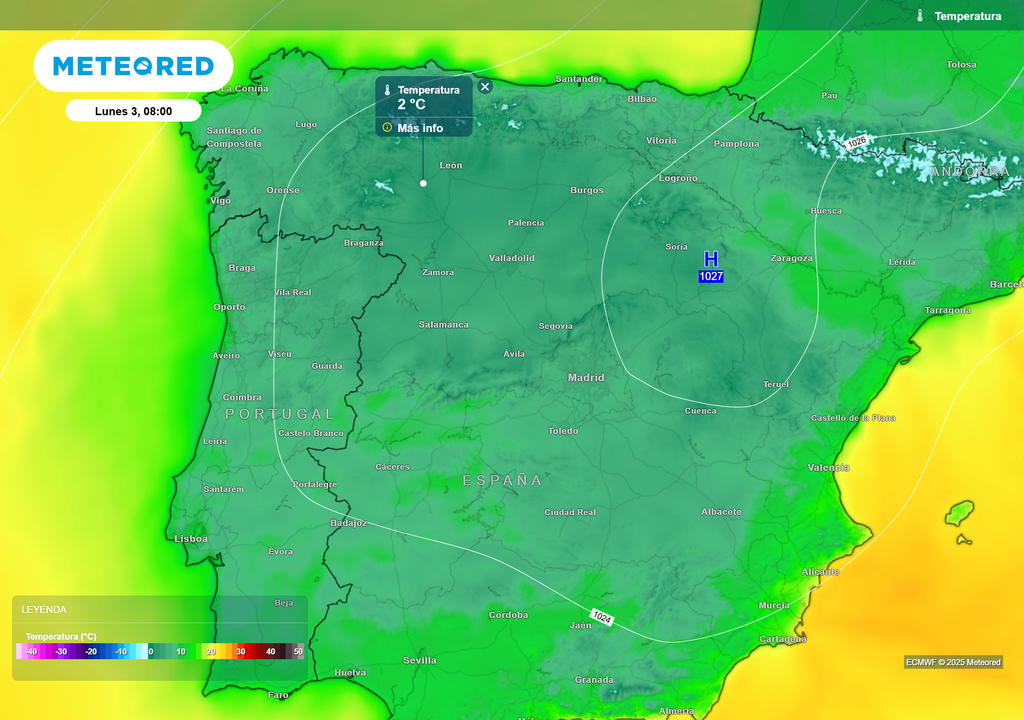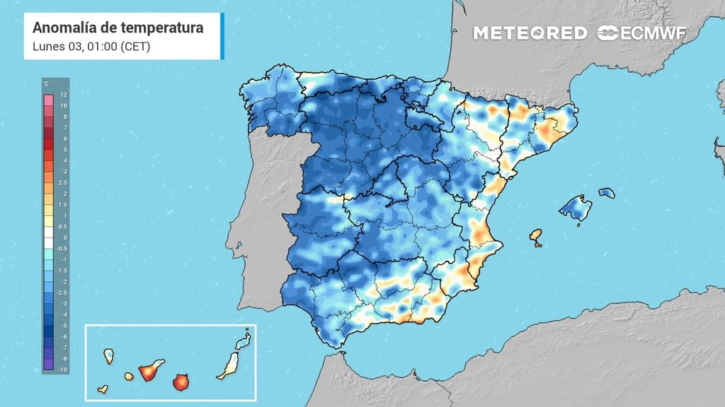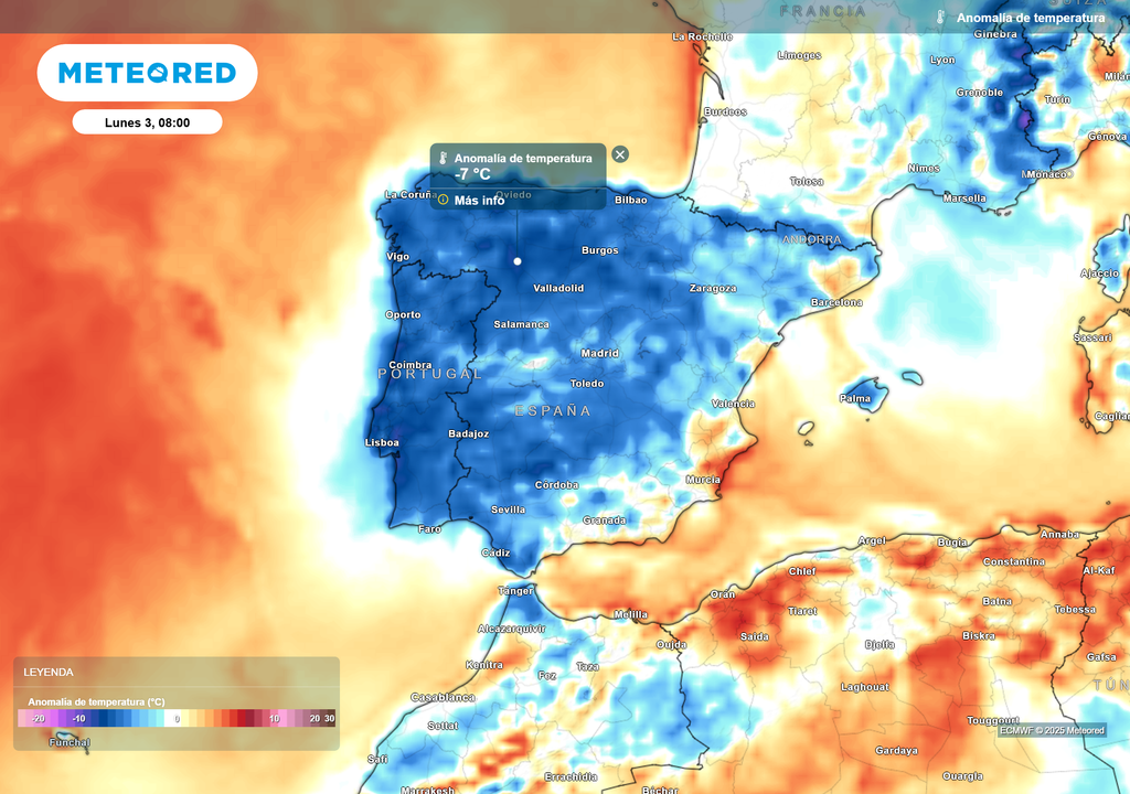 La madrugada del domingo al lunes será especialmente fría en amplias zonas de la vertiente atlántica, desde Huelva hasta los Pirineos, pasando por el centro peninsular. Las anomalías térmicas negativas podrían superar los 6 o 7 ºC, dejando valores bajos al amanecer.