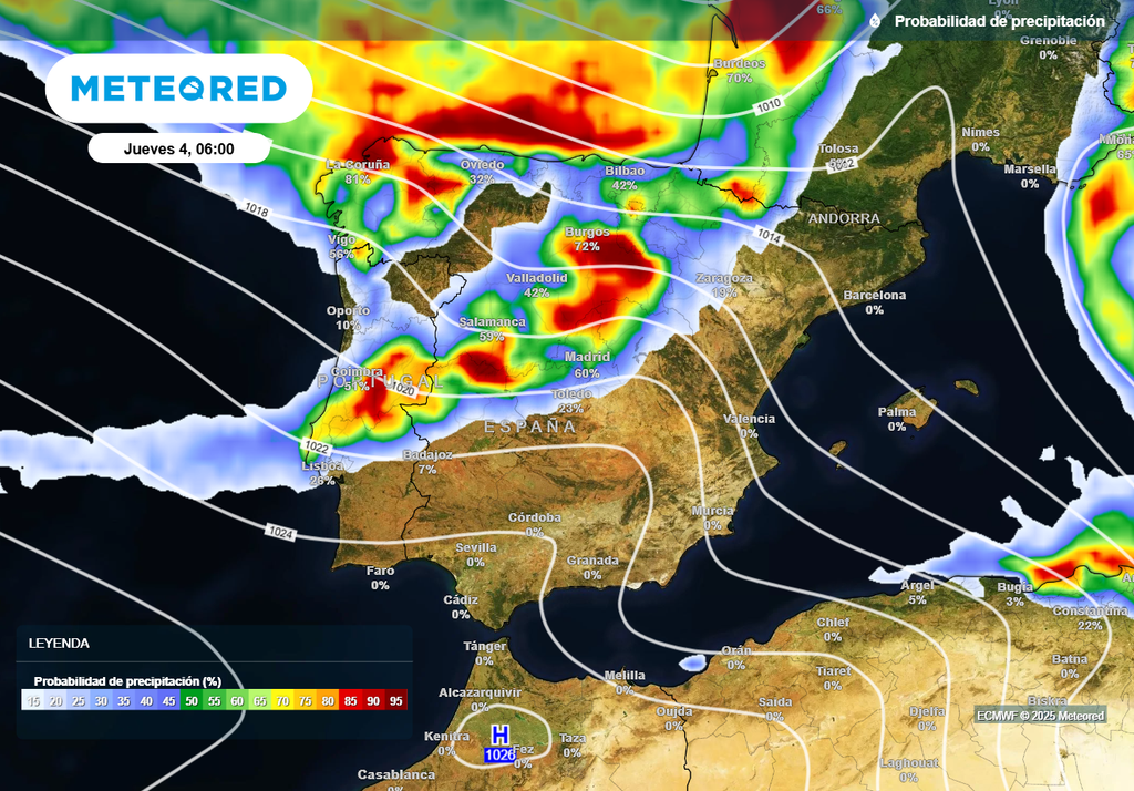 La circulación atlántica se mantendrá a corto y medio plazo, con más precipitaciones que llegarán desde el Atlántico. El tiempo tenderá a estabilizarse transitoriamente en más comunidades en el puente, con temperaturas que subirán en estos próximos días.