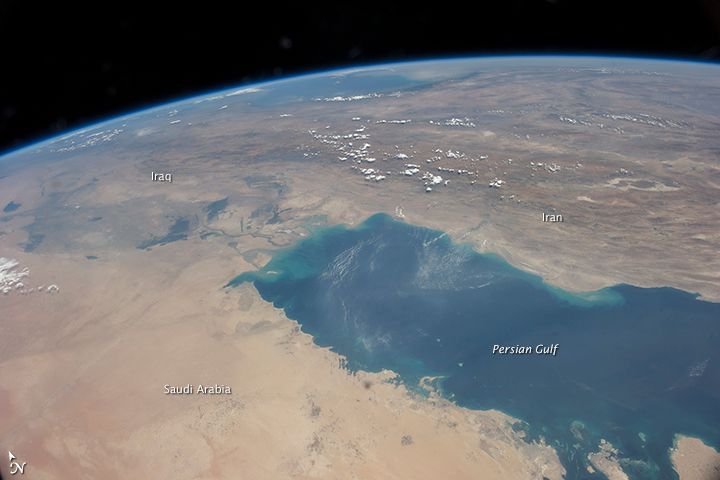 Estos panoramas tomados por los astronautas de la Estación Espacial Internacional muestran las tropicales aguas azules del Golfo Pérsico y posteriormente los cielos llenos de polvo mientras una gran tormenta de polvo oscurece la del Golfo y su costa norte.