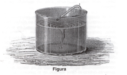 También en esta agua podemos observar la transición de un movimiento lento y vortiginoso a uno extraordinariamente rápido. Tan pronto el vórtice se haya formado, el desagüe es mucho más lento, porque la mayor parte del desaguador es ocupada por el aire. Es principalmente el agua del fondo del recipiente la que sale, después de haber perdido su velocidad por fricción con el vidrio. Si se echa arena en el agua, desciende rápidamente en líneas espirales hasta la apertura, donde es expulsada, mientras que pedacitos de oblea, suspendidos en el agua, pueden participar, sin acercarse a la apertura, del movimiento rotatorio durante docenas de minutos. Los ciclones tienen cerca de la superficie el mismo movimiento en espiral hacia el centro. También para éstos estamos autorizados a suponer que es principalmente la poderosa fuerza centrífuga la que retarda el ascenso del aire caliente. Sólo en la medida en que el tremendo movimiento rotacional es mermado cerca de la superficie por fricción, podrá ascender el aire, sin dejar de girar arriba, hasta agrandar sus círculos y disminuir su rotación en la medida en que nuevo aire viene a reemplazarla.