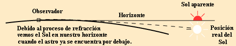 La luz se refracta al pasar de un medio a otro donde su velocidad de propagación es diferente. En otras palabras, cuando la luz pasa de un medio donde se desplaza rápidamente a otro donde su velocidad es menor, entonces el haz se curva hacia adentro. Cuando el Sol nos ilumina durante el día los haces solares no se curvan apreciablemente pero cuando él aparece o se oculta por el horizonte sus haces se curvan “buscando” la Tierra, Fig. 3. Así, si el Sol se está ocultando por el horizonte aparente, él ya está por debajo de dicha línea asociado a nuestro horizonte visual.