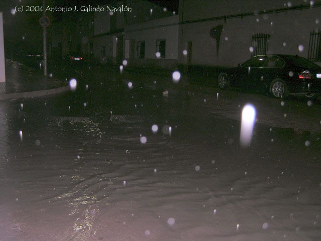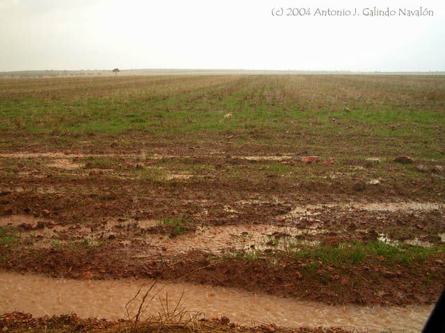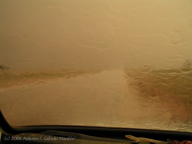 Situé el coche de forma inclinada lateralmente para poder bajar la ventanilla contraria y fotografiar los campos anegados y la violencia de los gotazos al impactar...