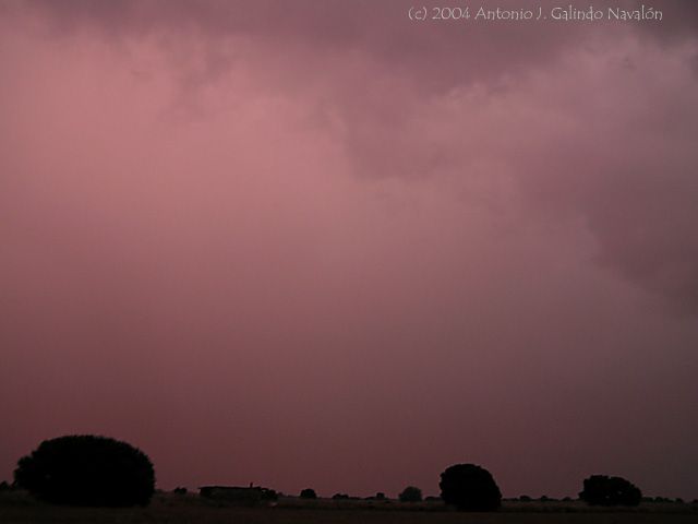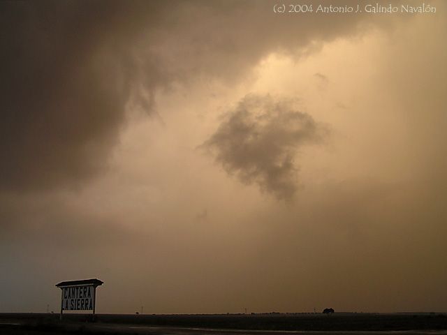 No hay que imaginarse que este color del cielo es irreal y lo he insertado intencionadamente, vamos, para estar allí conmigo, escuchando además como los granizos de medio centímetro de diámetro convertían mi coche en una improvisada caja de resonancia; a punto estuve de dar marcha atrás pensando en la integridad de mis posesiones , de hecho me detuve y no avancé mas en ese preciso momento porque lo que tenia delante probablemente derramaría tamaños mayores del medio centímetro... y a la vez el retumbar cercano de los truenos...