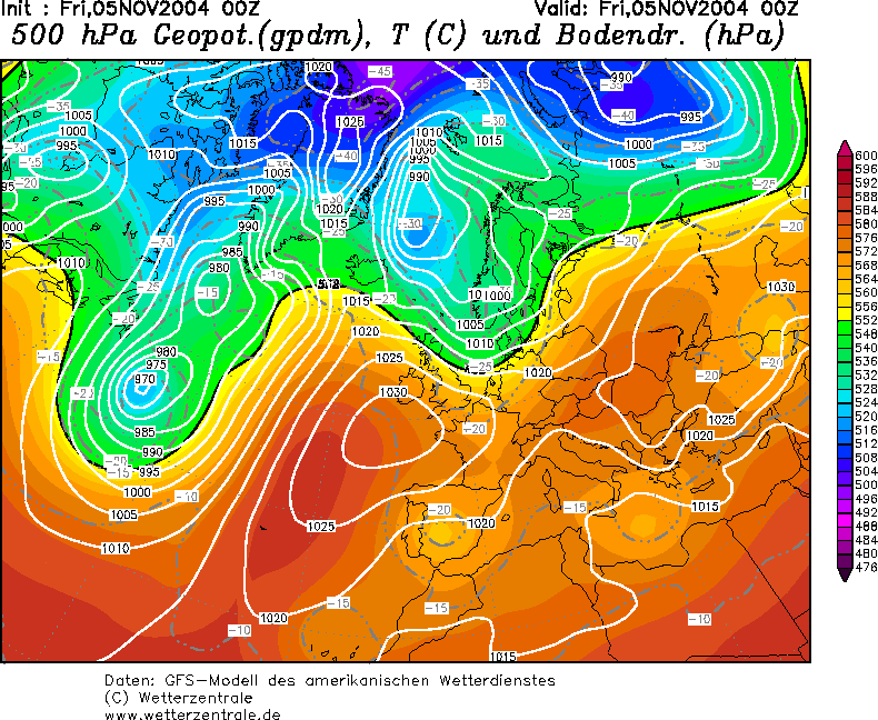 El análisis de las 00:00 UTC del día 5 (momento más cercano al evento), muestra una situación sinóptica inequívoca, señalada por una DANA (Depresión Aislada en Niveles Altos) en la topografía absoluta de 500 hPa. posicionada sobre el centro geográfico peninsular, que en superficie no se refleja, es mas, aparecen altas presiones. Igualmente sobre los 5600 msnm. aproximadamente existía un pequeño embolsamiento de aire frío entre –20 y –25 ºC.